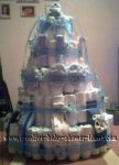 It is a three layered cake made with 72 diapers, the insides of each layer are wrapped roll style and the outside is diapers overlapped to make it look like cake icing. I then tied two burp clothes fan style and placed on top for the topper setting. On top of that is this cute precious moments praying doll, holding a lollipop wash cloth, the stick being a soft tipped spoon. I also placed some samples of soaps, wash clothes folded like rose buds, a bottle, and socks folded a rose buds around the bottom, placed it all on a plate for serving. She said this was the talk of the shower.